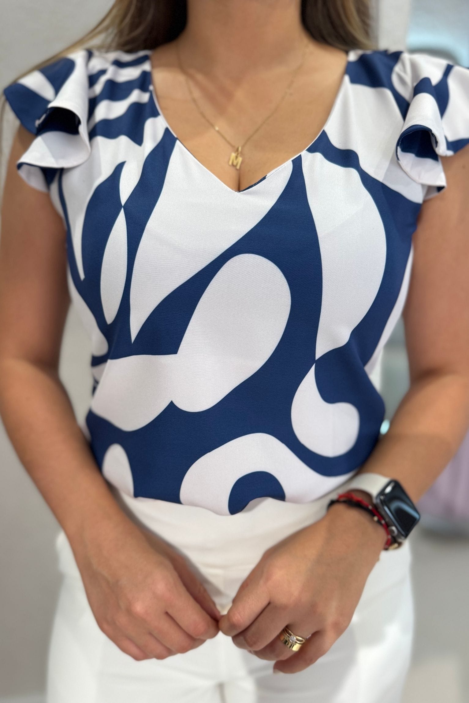 La blusa que lleva la modelo, quien es talla S, tiene un diseño elegante y fluido con mangas cortas que presentan un detalle de volantes en los hombros, aportando un toque sofisticado y femenino. Su escote en V es favorecedor y añade un aire moderno al diseño. Está elaborada en seda estudio, lo que le otorga una caída suave y un acabado refinado, ideal para un look tanto casual como más formal.