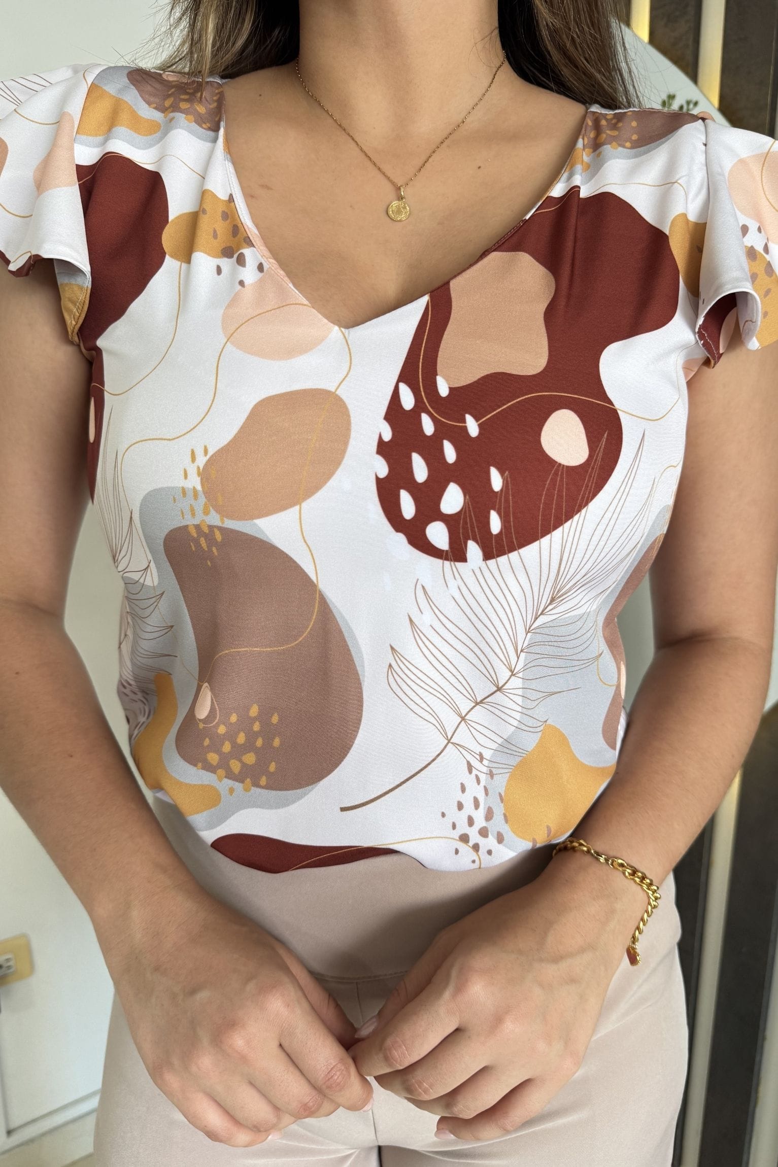 La blusa que lleva la modelo, quien es talla S, tiene un diseño elegante y fluido con mangas cortas que presentan un detalle de volantes en los hombros, aportando un toque sofisticado y femenino. Su escote en V es favorecedor y añade un aire moderno al diseño. Está elaborada en seda estudio, lo que le otorga una caída suave y un acabado refinado, ideal para un look tanto casual como más formal.