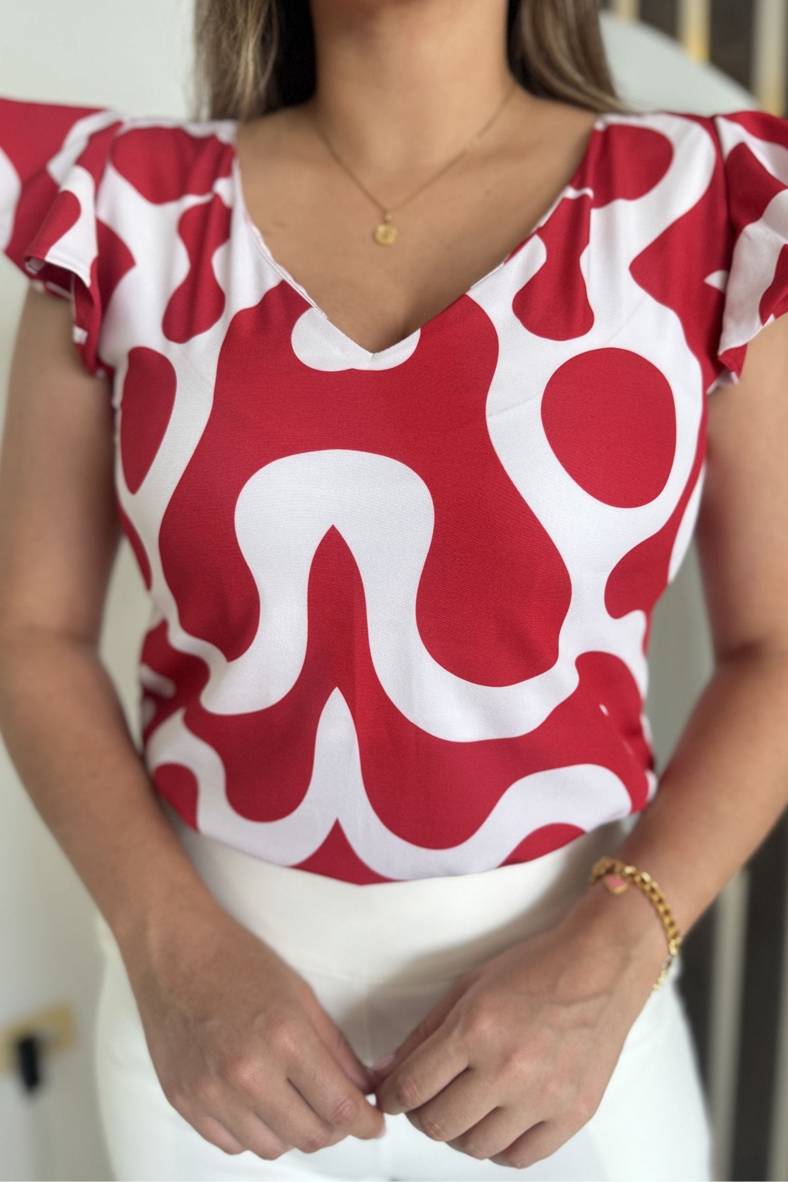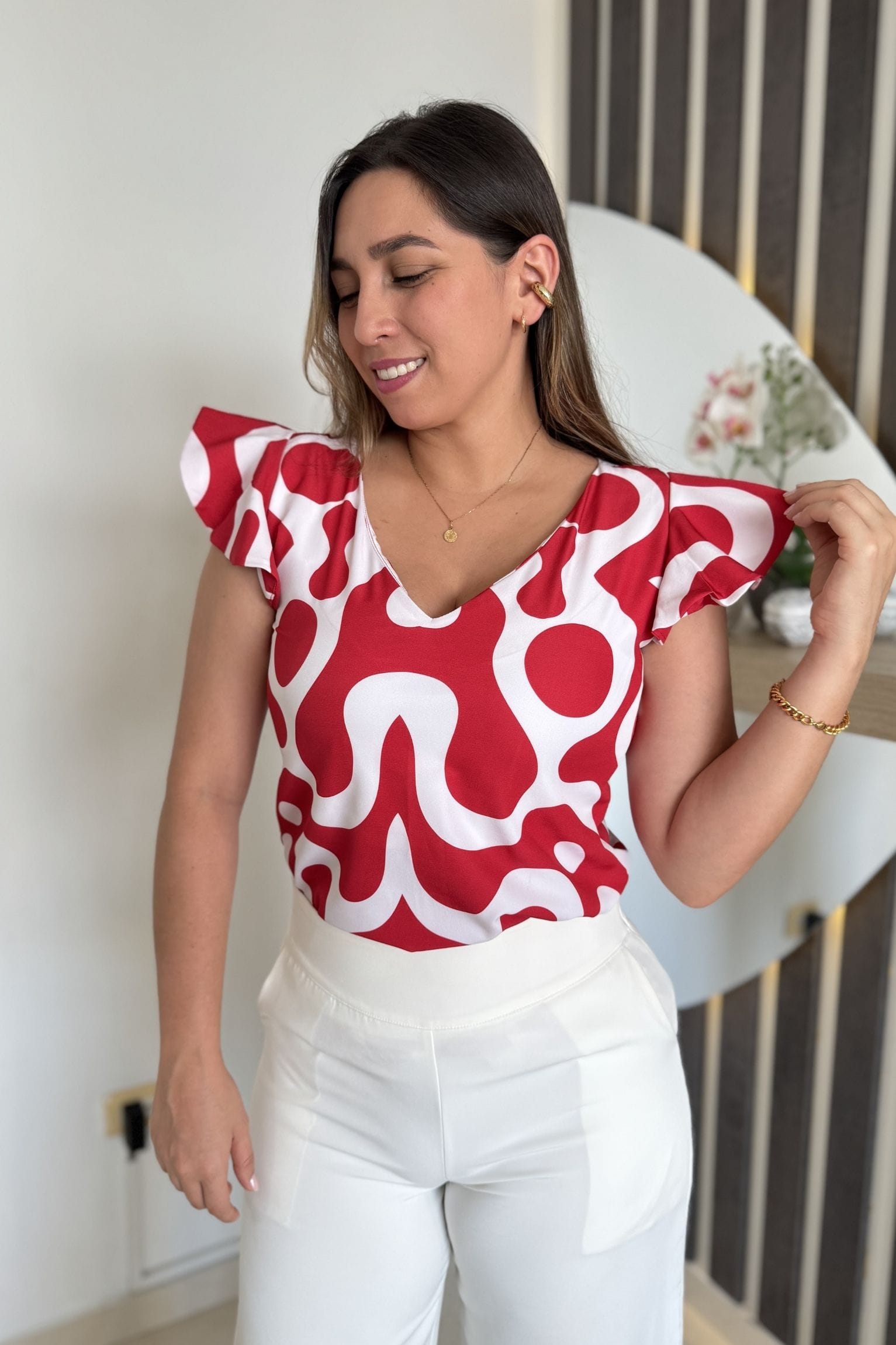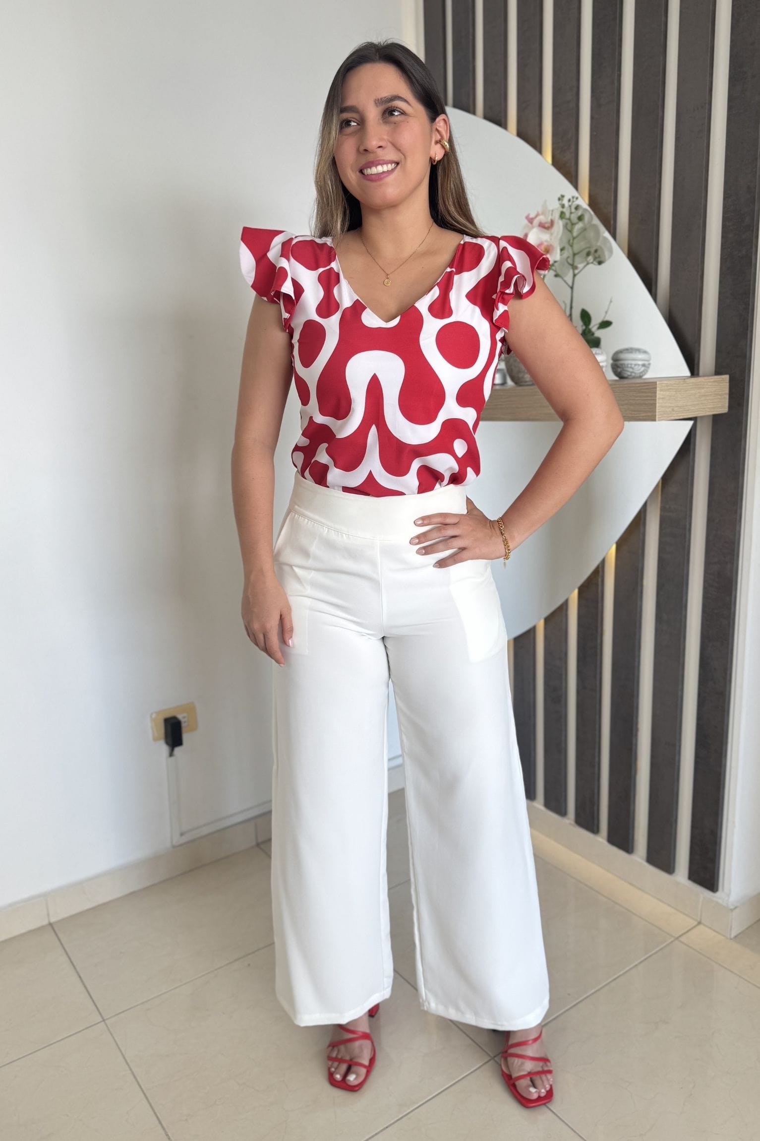 La blusa que lleva la modelo, quien es talla S, tiene un diseño elegante y fluido con mangas cortas que presentan un detalle de volantes en los hombros, aportando un toque sofisticado y femenino. Su escote en V es favorecedor y añade un aire moderno al diseño. Está elaborada en seda estudio, lo que le otorga una caída suave y un acabado refinado, ideal para un look tanto casual como más formal.