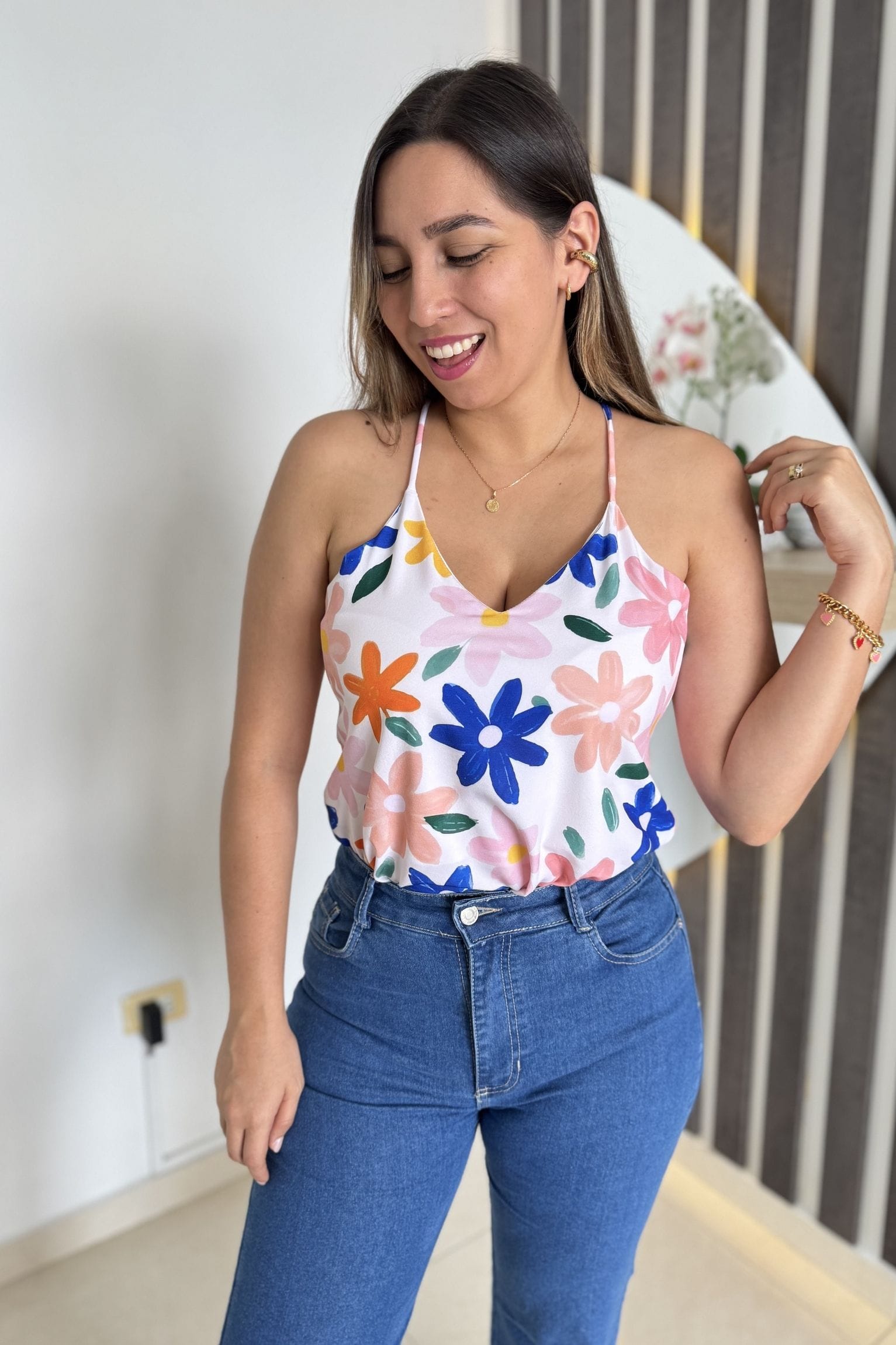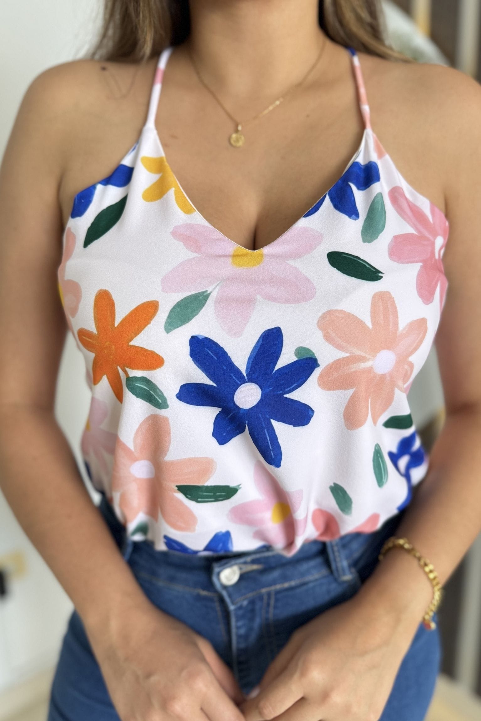 La blusa que lleva la modelo, quien es talla S, es un diseño sin mangas con tirantes finos y un corte fluido que cae suavemente sobre el cuerpo. Está elaborada en seda estudio, lo que le otorga una textura suave y un acabado elegante, perfecta para un estilo fresco y versátil.