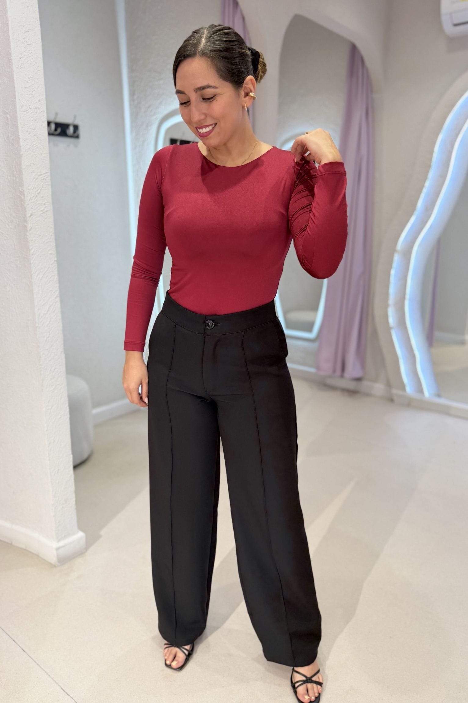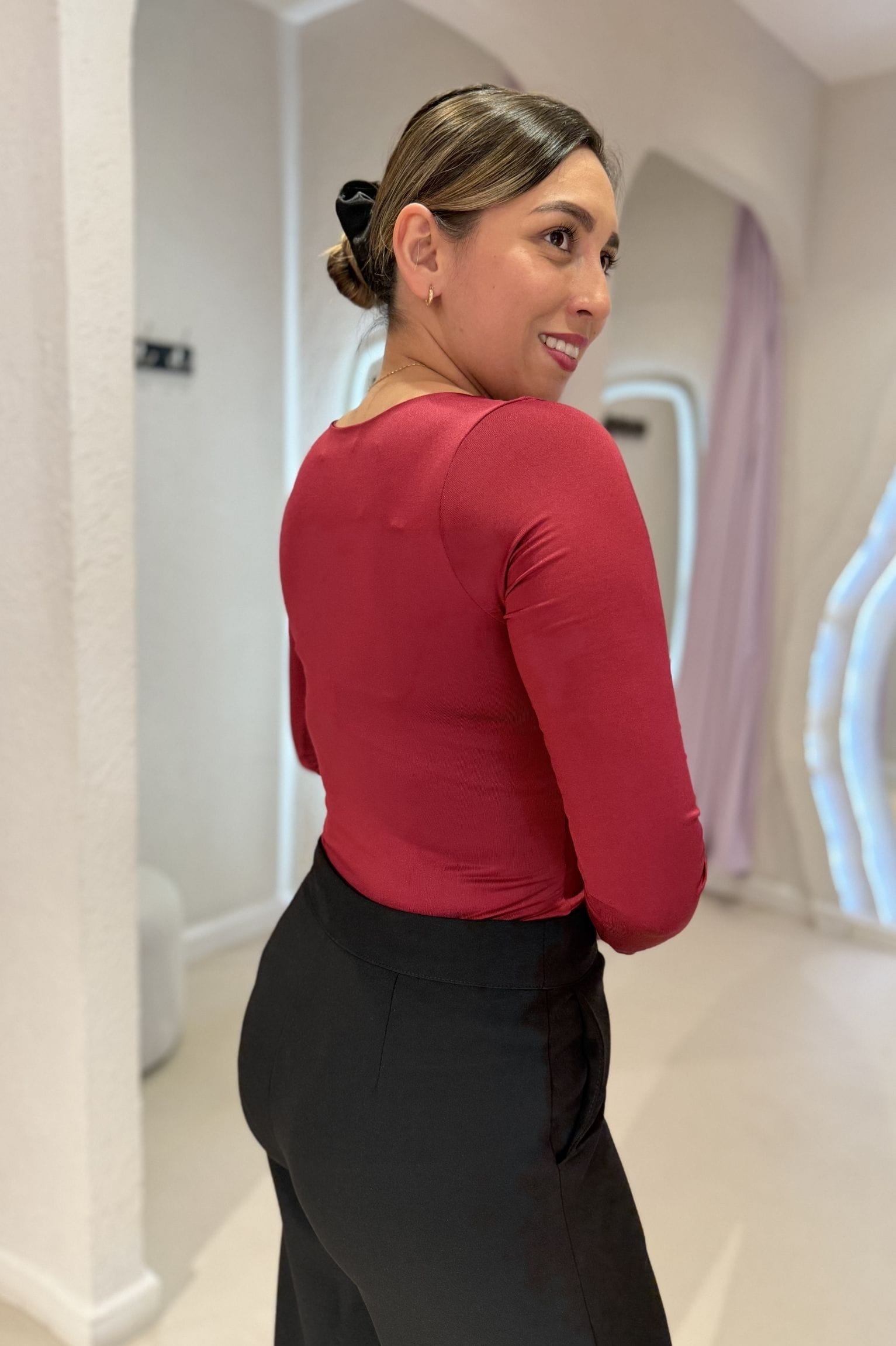 Body elaborado en Acetato de tacto suave y acabado liso que se ajusta perfectamente al cuerpo. Su diseño de manga larga y silueta estilizada lo convierte en una prenda elegante,comoda y versatil, ideal para looks sotisficados o casuales con un toque moderno. La modelo usa talla S-M.