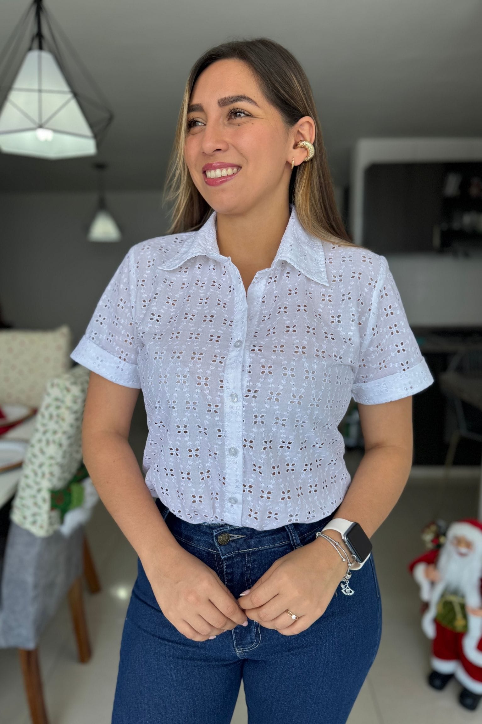 Blusa confeccionada en tela de ojalillo, ligera y fresca. Presenta un diseño de manga corta con cuello clásico y cierre frontal de botones. Su estructura ofrece un ajuste cómodo y femenino, ideal para looks casuales y versátiles.La modelo usa talla S, silueta semi-amplia