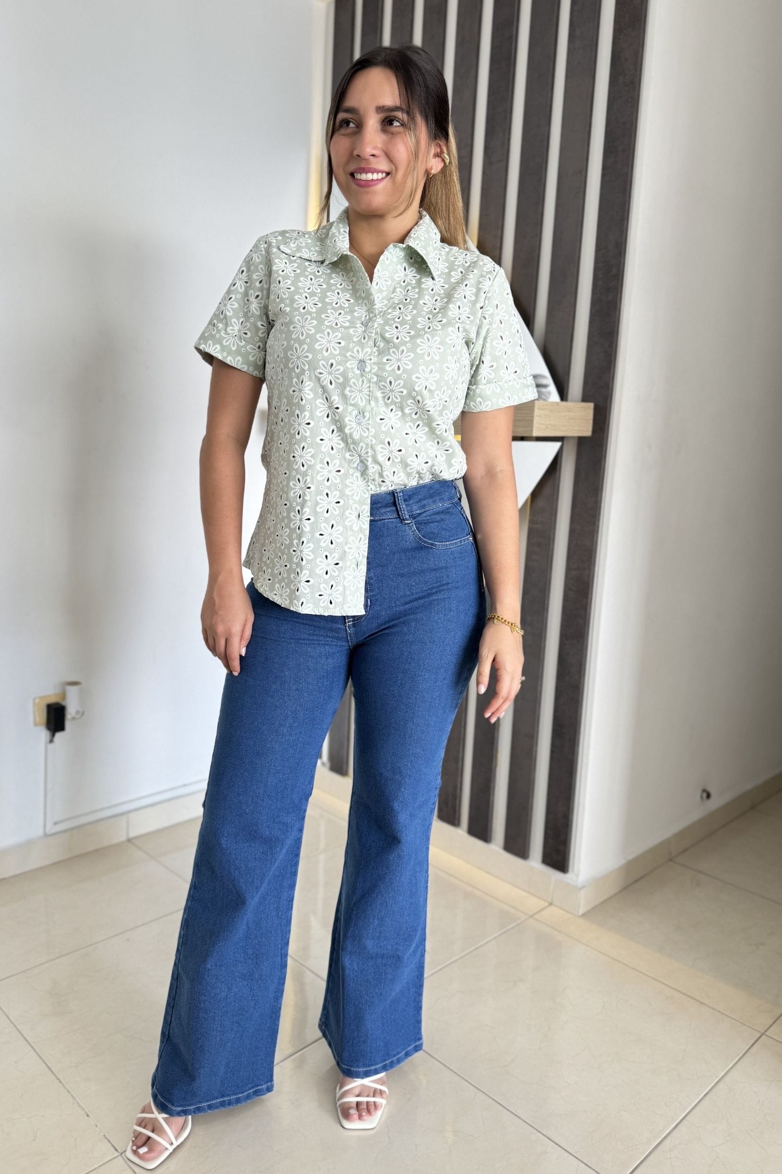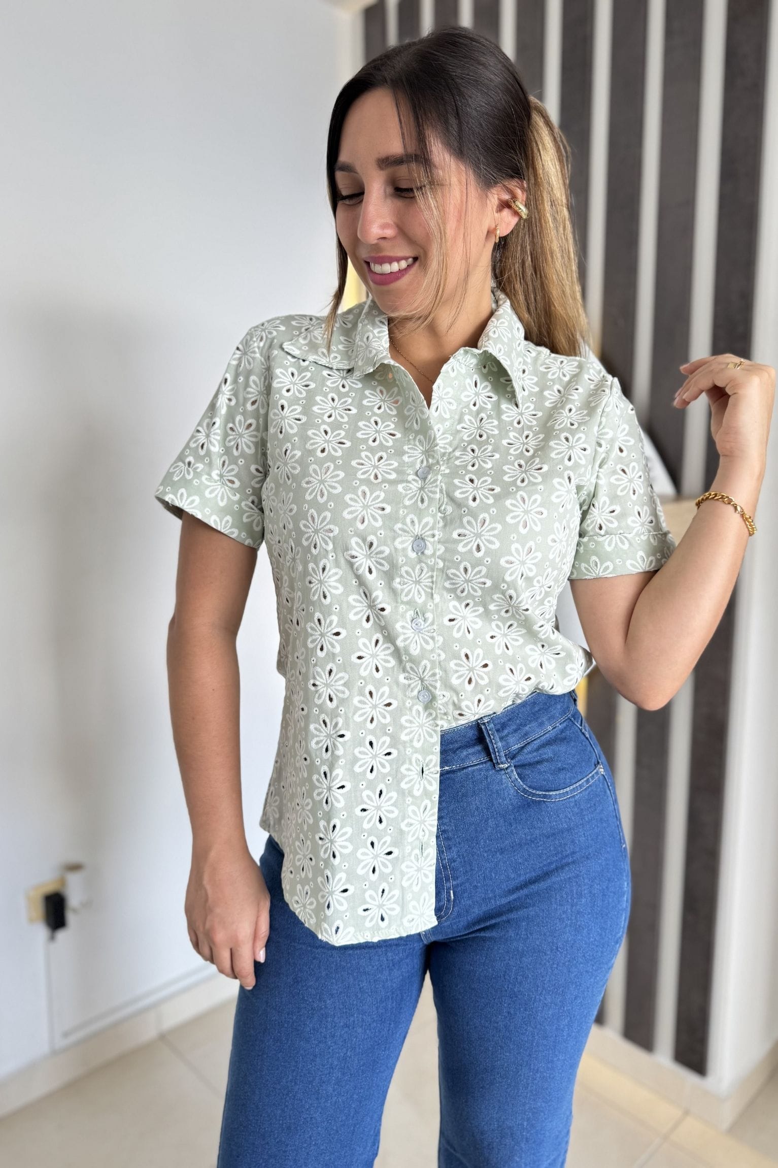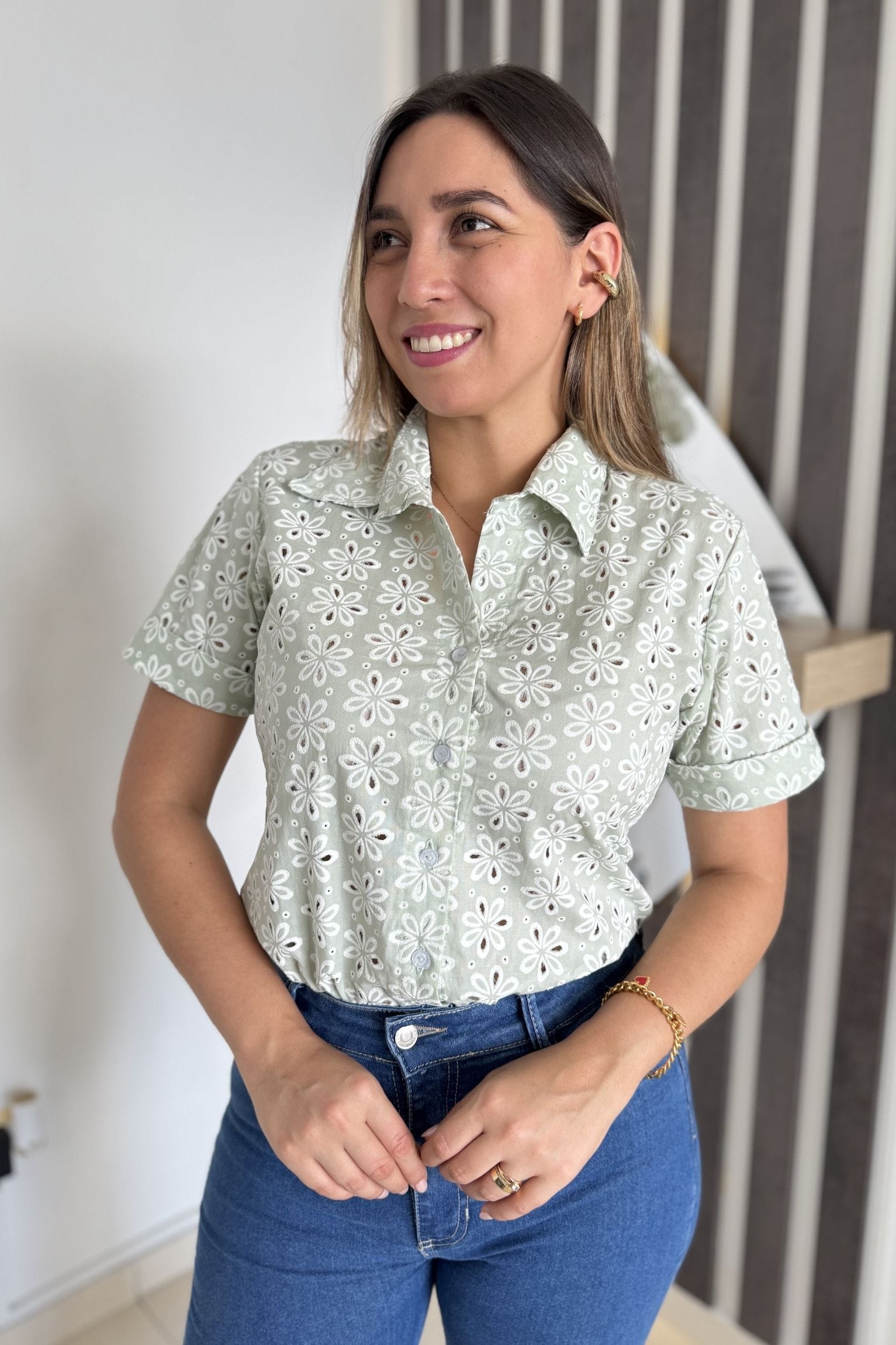 camisera confeccionada en tela de ojalillo, ligera y fresca. Al ser generalmente de algodón u otras telas ligeras, ayudan a mantenerte cómoda en días calurosos, es un diseño de manga corta con cuello clásico y cierre frontal de botones. Su estructura ofrece un ajuste cómodo y femenino, ideal para looks casuales y versátiles.La modelo usa talla S, silueta semi-amplia.