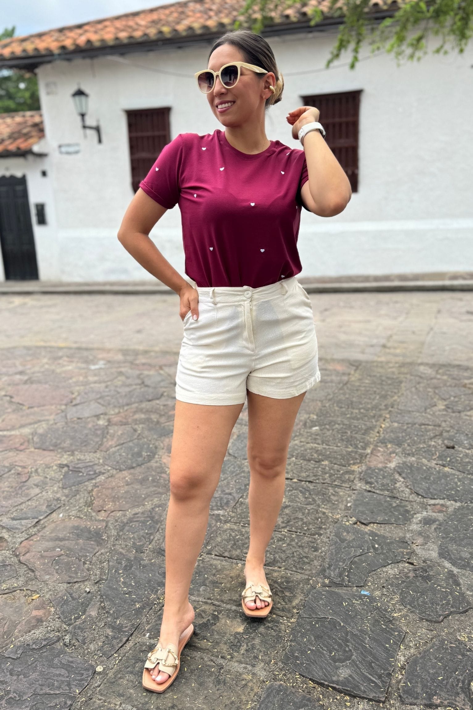Camiseta elaborada en algodón de alta calidad, suave al tacto y de excelente transpirabilidad.Presenta delicados bordados que aportan un detalle sutil y femenino,elevando un diseño básico y versátil.
