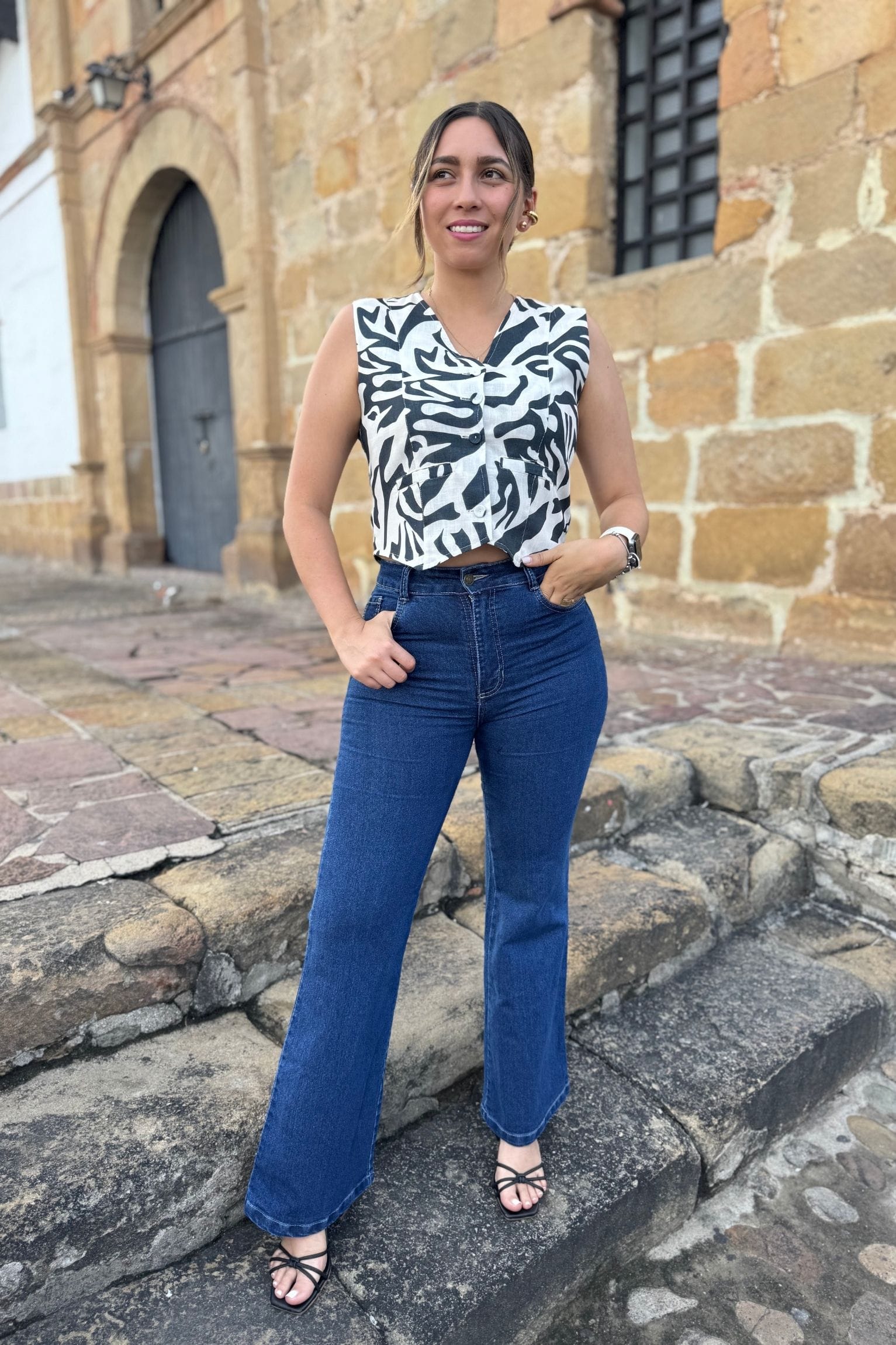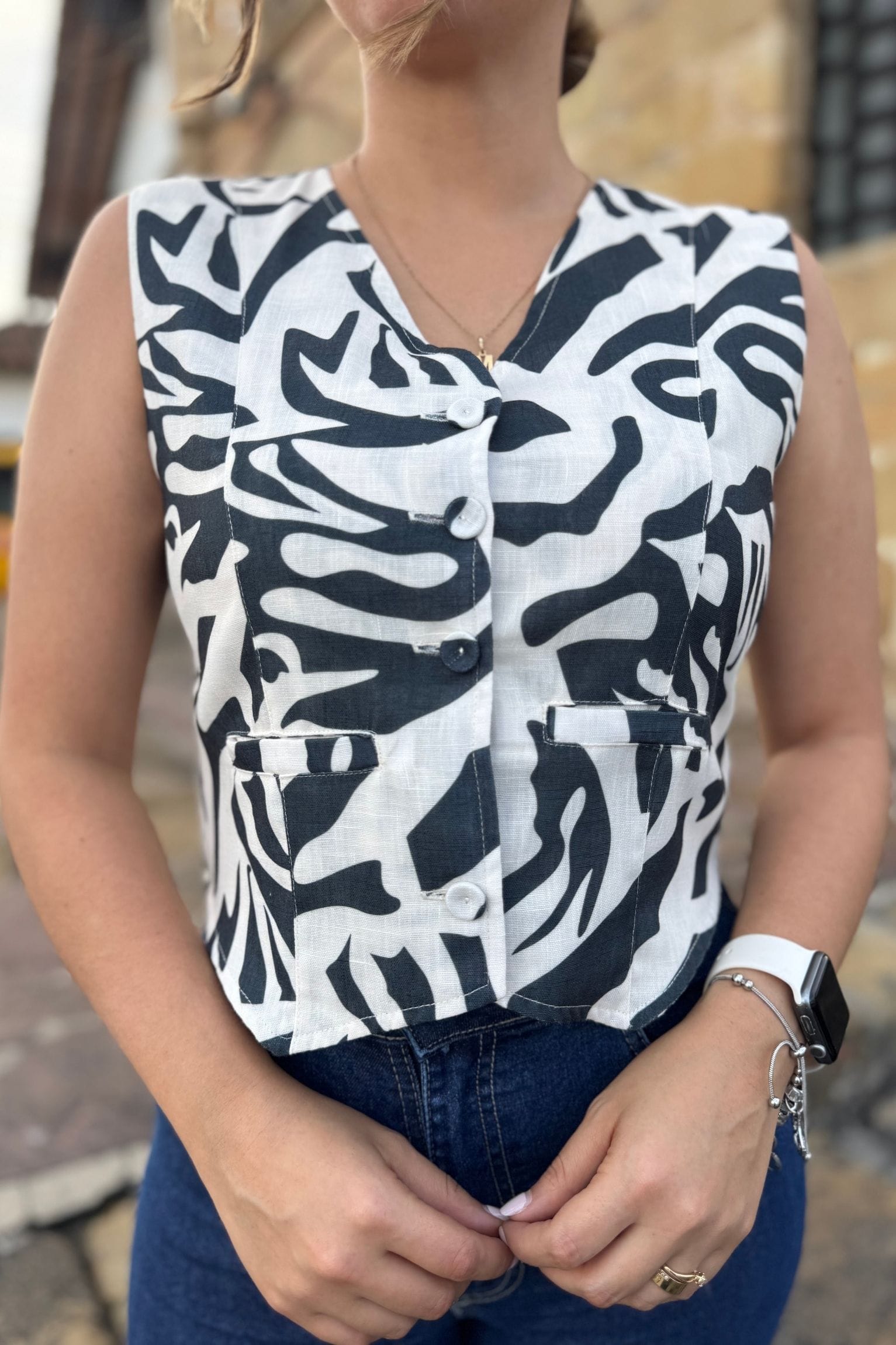 Blusa sin mangas de corte recto con cuello en V y botones frontales. Confeccionada en lino, ligera y fresca, ideal para un look cómodo y versátil. La modelo usa talla M.