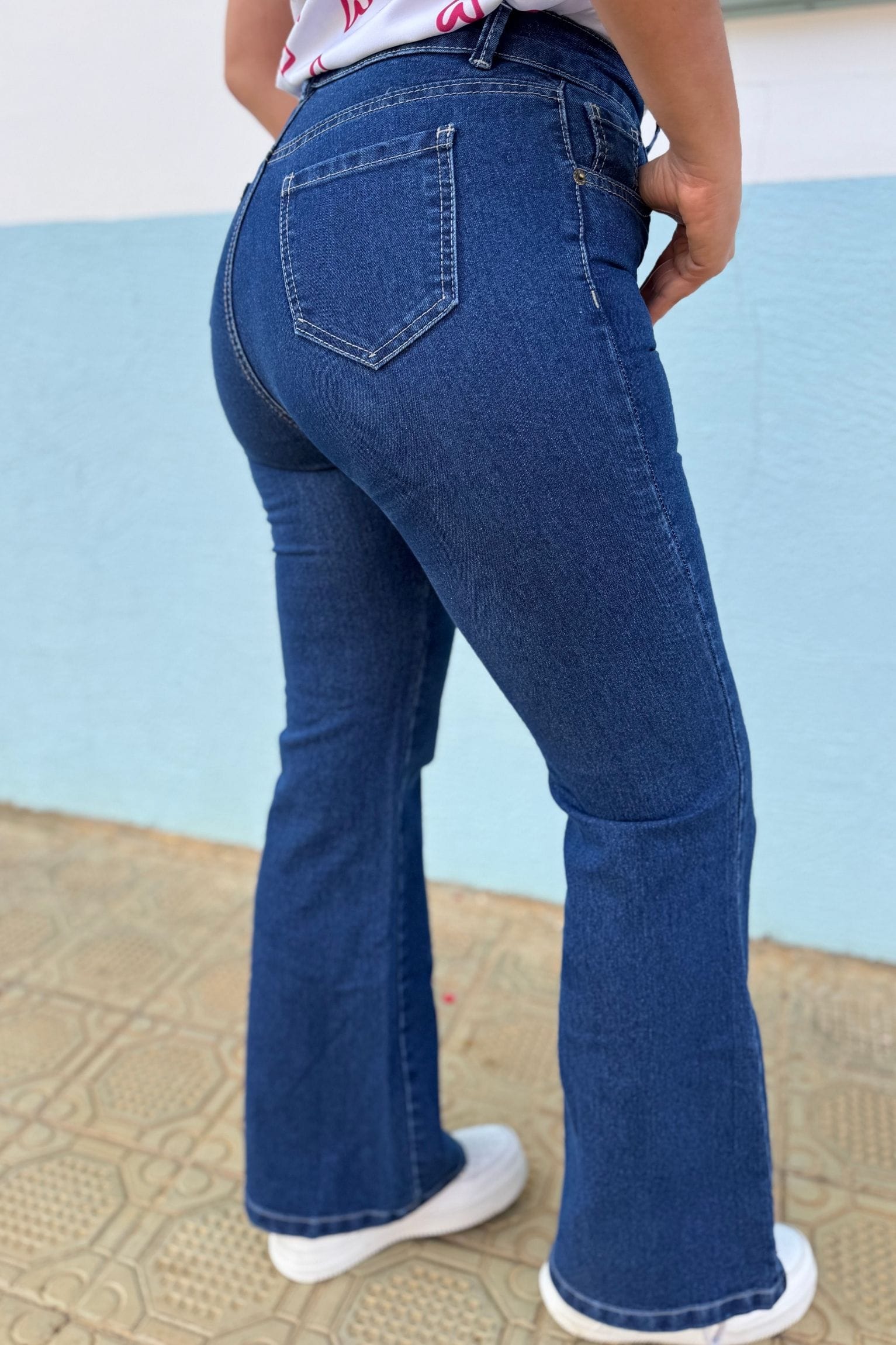 Pantalón de mezclilla con corte recto desde la cadera que se ensancha gradualmente desde la rodilla hacia el dobladillo, creando una silueta acampanada. Incluye cinco bolsillos tradicionales, cierre con botón y tiro medio que proporciona comodidad y estilo retro.