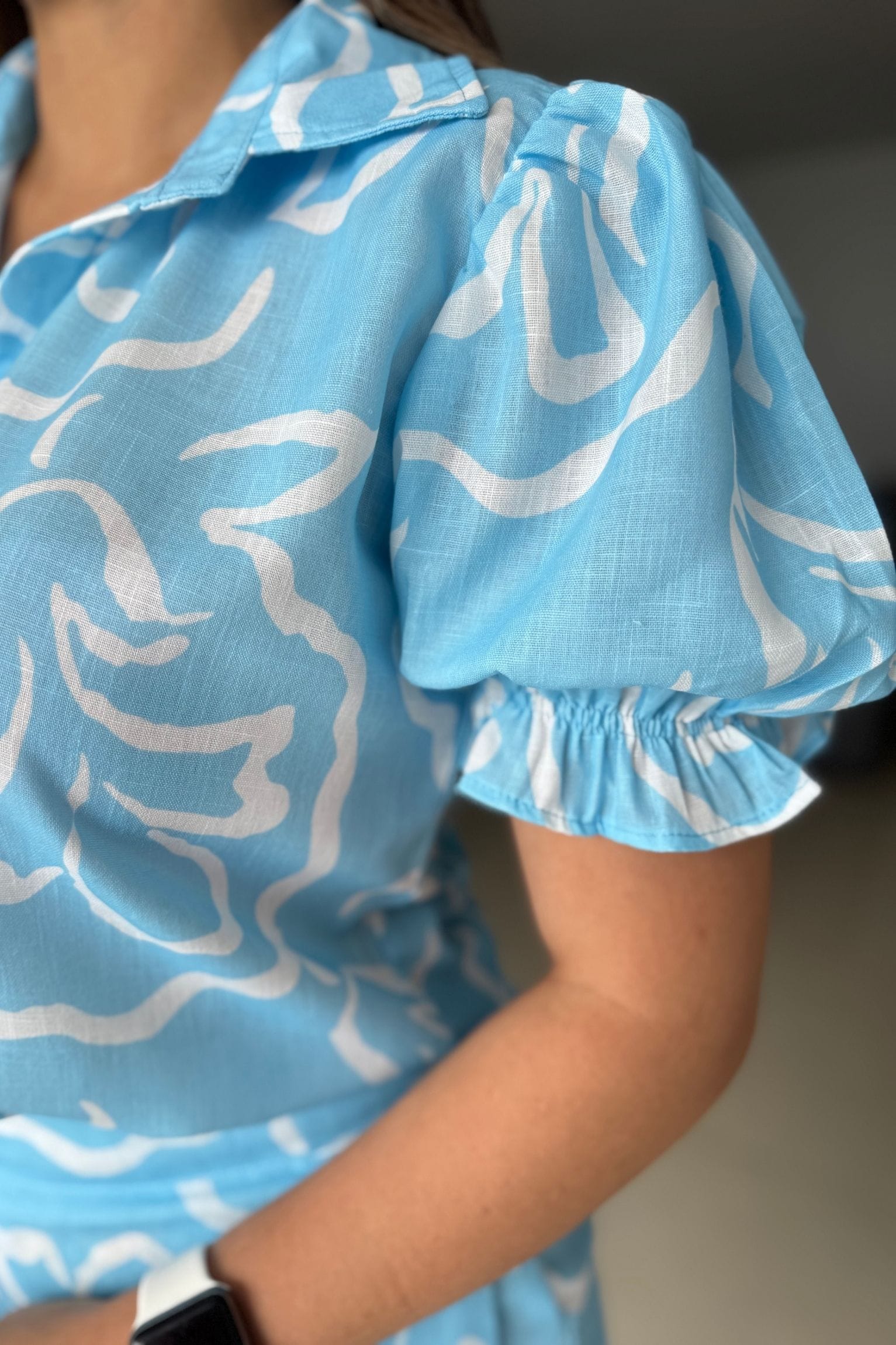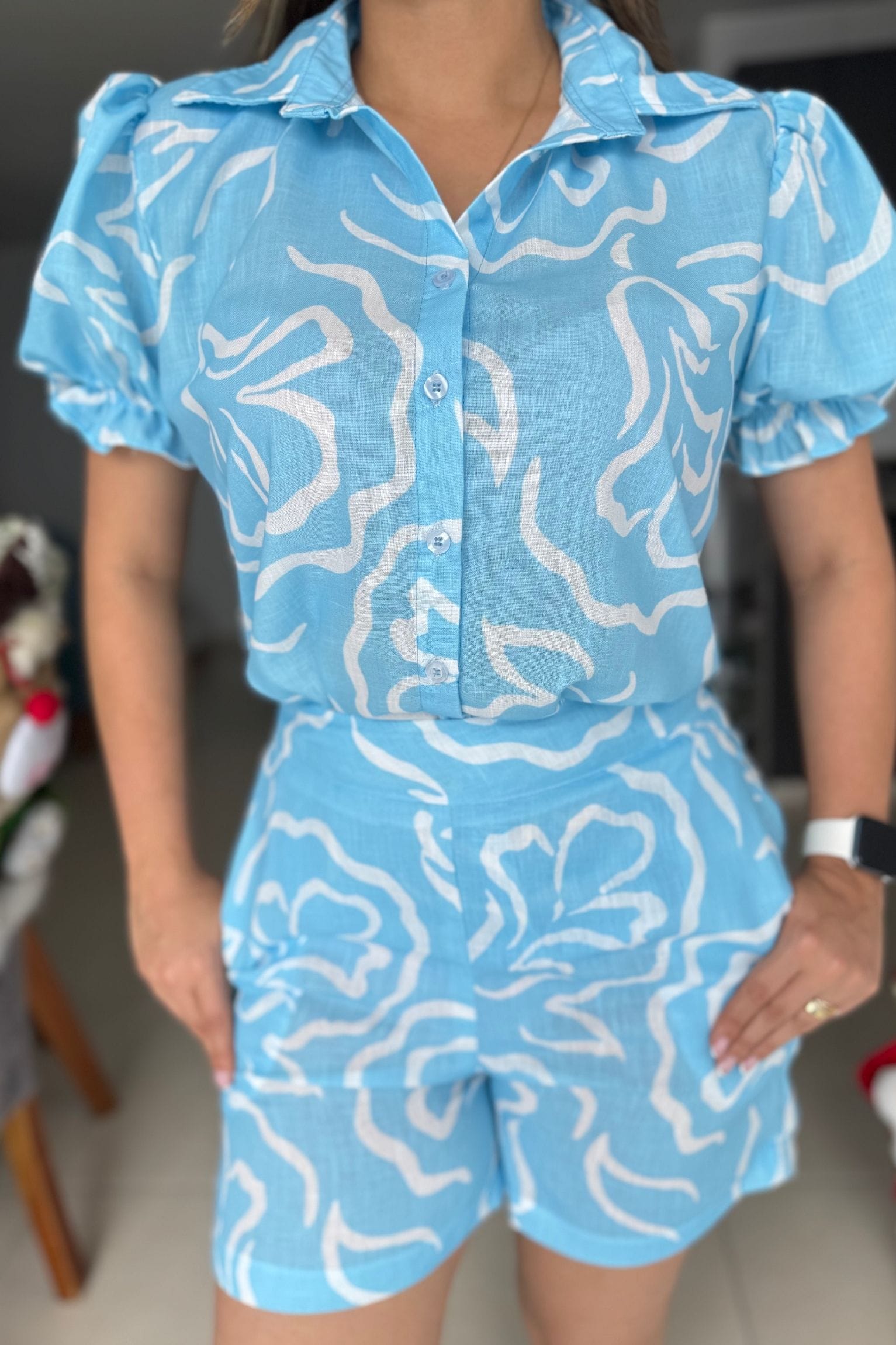 Este set de dos piezas en lino combina frescura, comodidad y estilo en un diseño moderno y versátil. La blusa cuenta con mangas abullonadas y cuello camisero, lo que le da un toque femenino y sofisticado. El short de talle alto complementa perfectamente el conjunto, ofreciendo una silueta favorecedora y relajada. Ideal para climas cálidos, la modelo usa talla S.