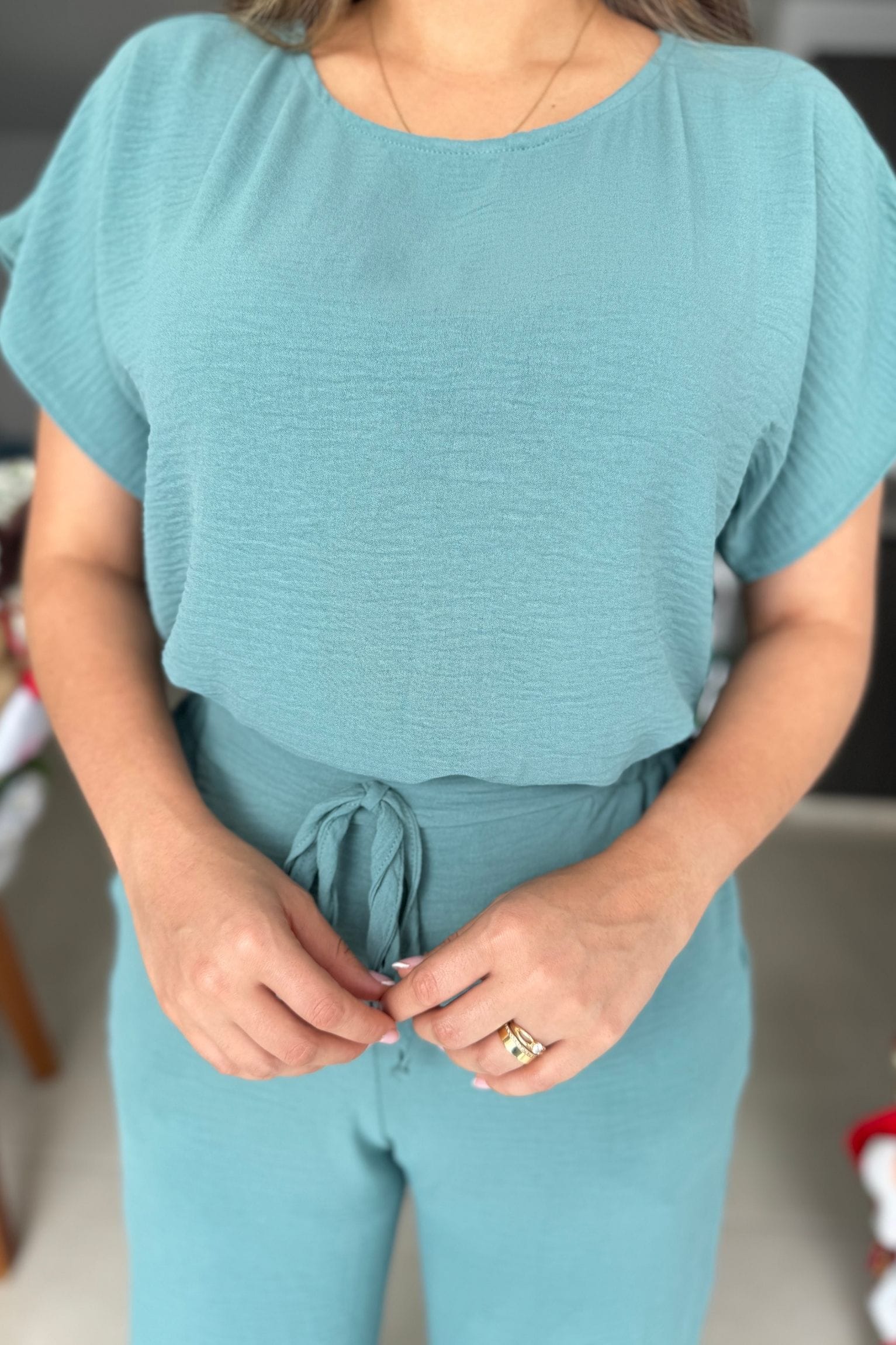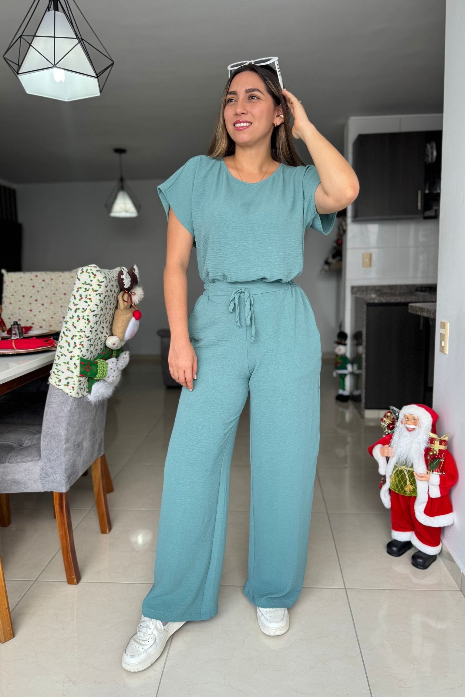 Set elaborado en seda crepé, compuesto por un pantalón de tiro alto y corte recto, con ajuste de lazo en la cintura que permite un calce cómodo y favorecedor. La parte superior es una blusa de manga corta con un diseño suelto y escote redondo, ideal para un look fresco y versátil. La modelo usa talla S.