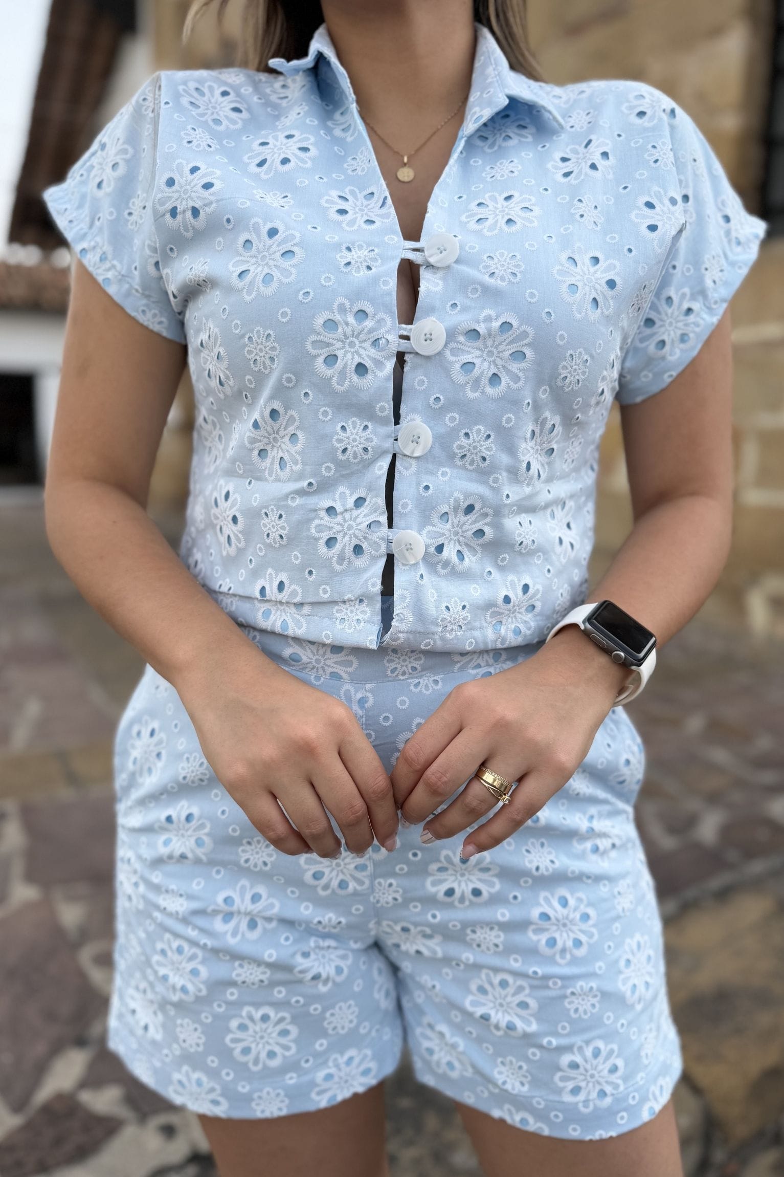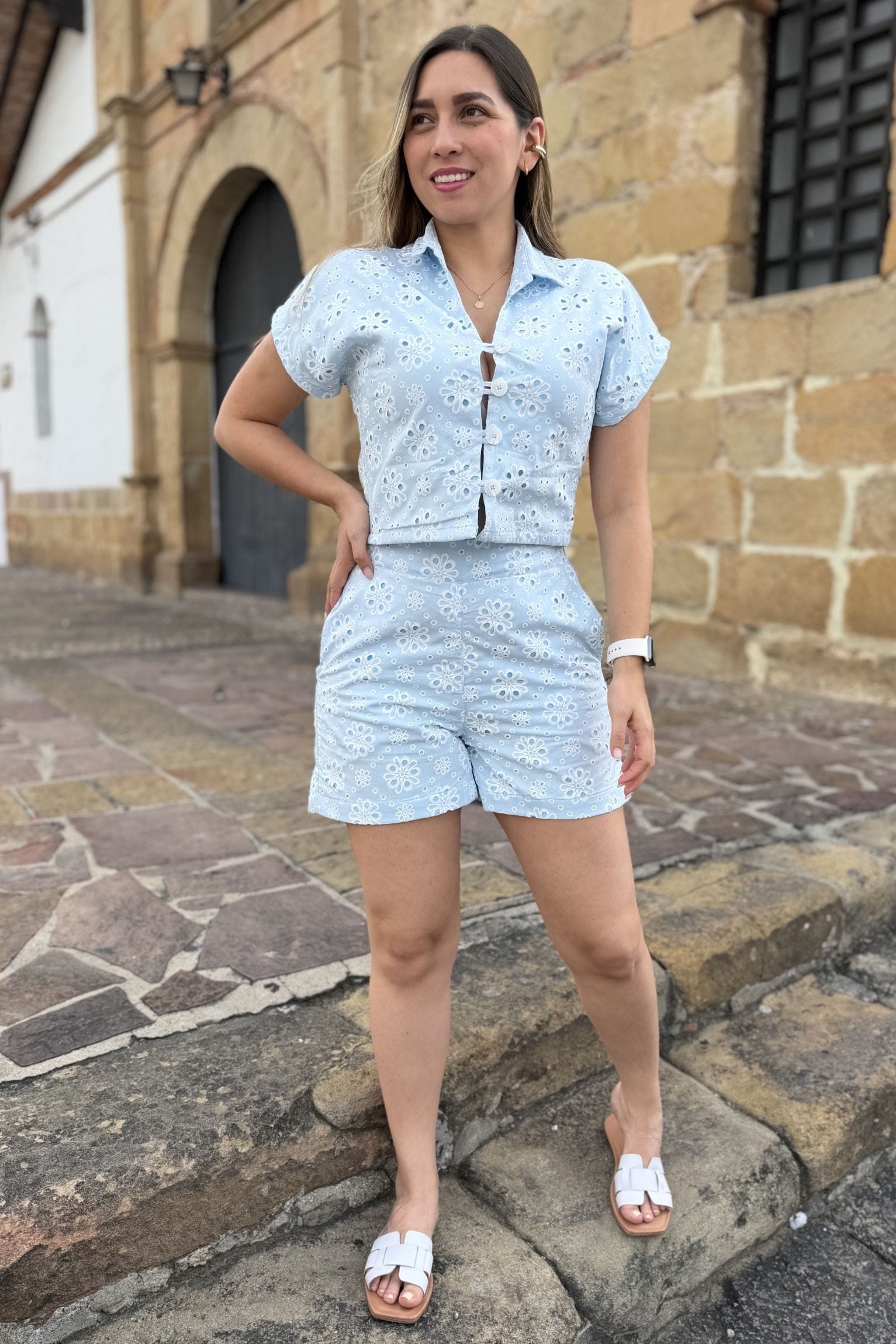 El set está elaborado en lino ojalillo y consta de una blusa con manga corta y botones frontales, acompañada de unos shorts. La modelo utiliza la talla S, destacando un diseño fresco y versátil.