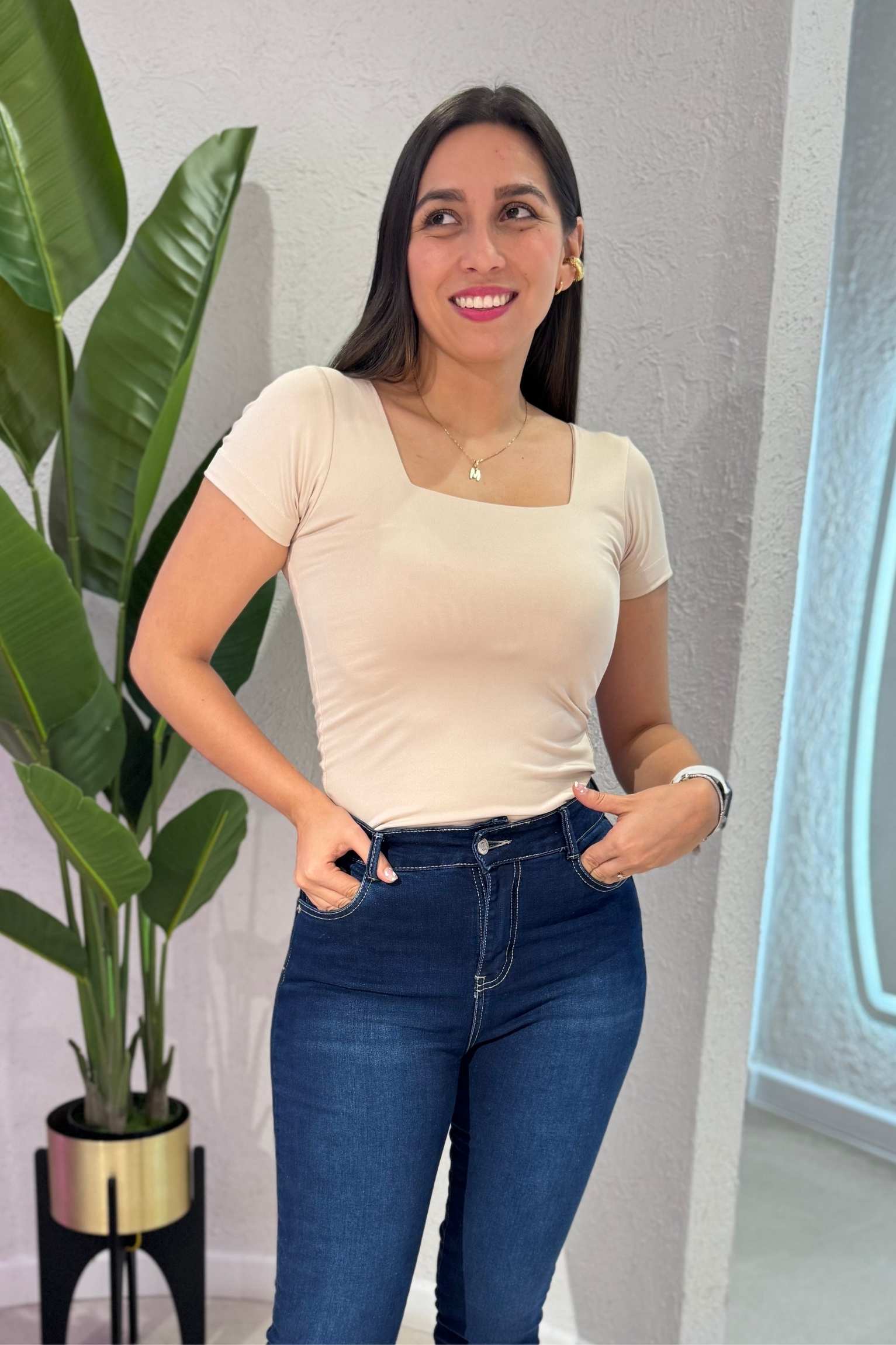 El top que lleva la modelo, quien es talla S-M, tiene un diseño ajustado y elegante con mangas cortas y un escote cuadrado que resalta la clavícula, aportando un toque sofisticado y femenino. Su corte ceñido define la silueta, haciéndolo ideal para un look moderno y versátil. Está elaborado en acetato licrado, lo que le confiere un acabado brillante y una textura elástica que se adapta cómodamente al cuerpo.