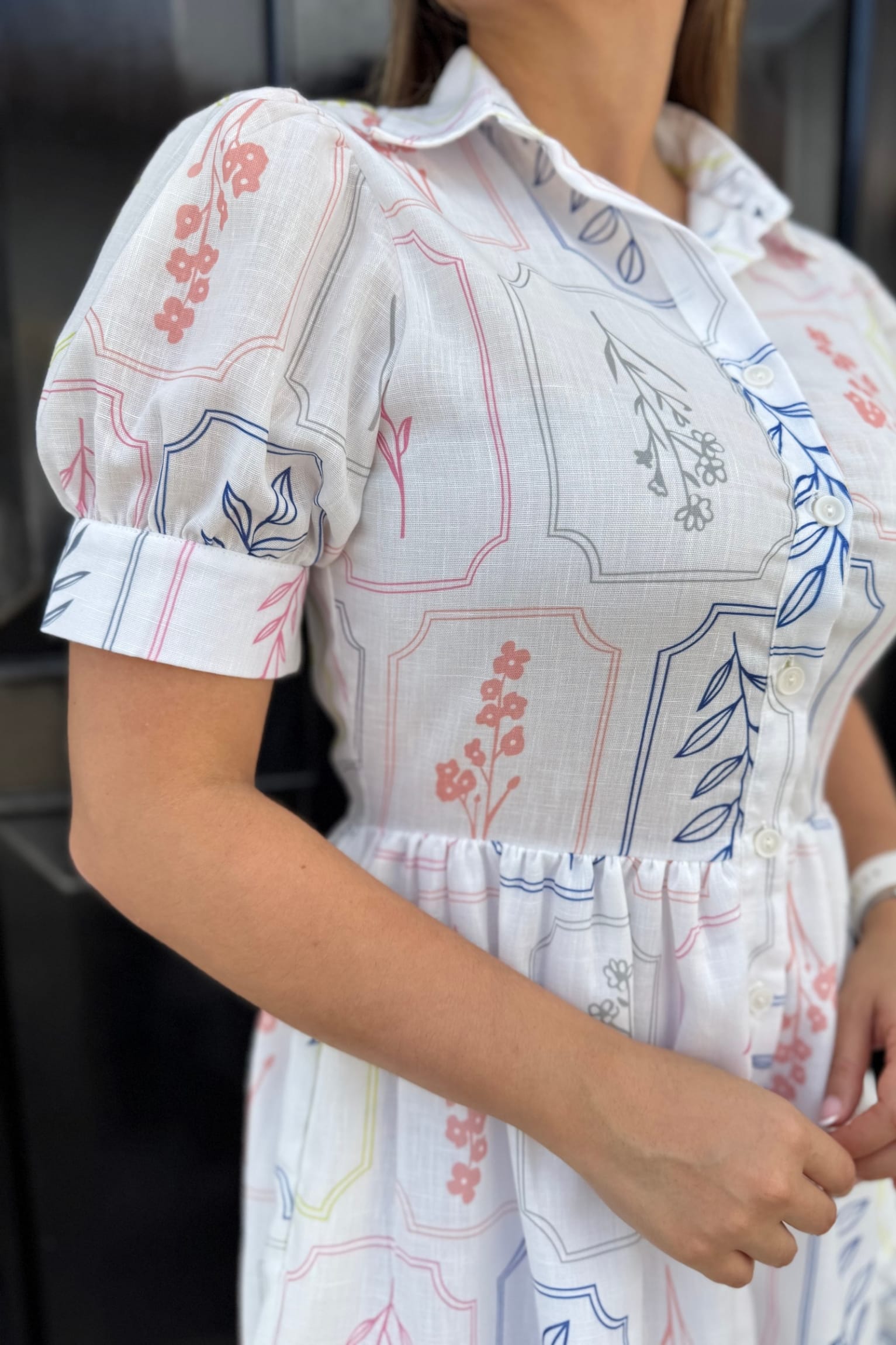 Vestido corto elaborado en lino, ligero y fresco. diseño camisero con botones frontales , mangas cortas abullonadas y parte inferior con leve vuelo. estampado floral delicado en tonos suaves, ideal para un look femenino y cómodo en climas cálidos. la modelo usa un talla S.