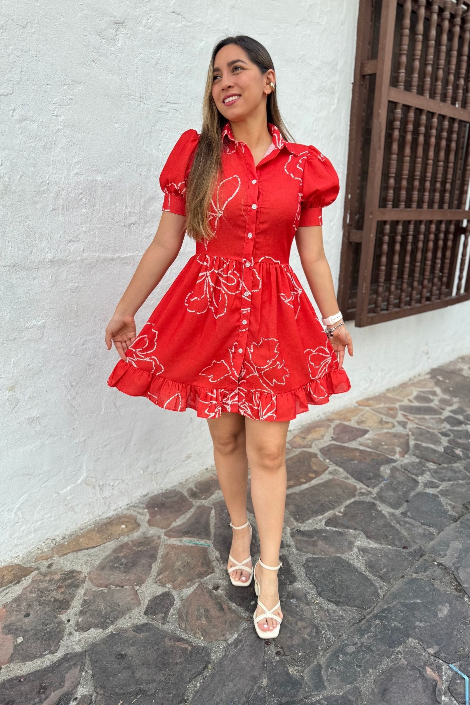 Vestido corto elaborado en lino, ligero y fresco. diseño camisero con botones frontales , mangas cortas abullonadas y parte inferior con leve vuelo. estampado delicado en tono rojos cerezo , ideal para un look femenino y cómodo en climas cálidos. la modelo usa un talla S.